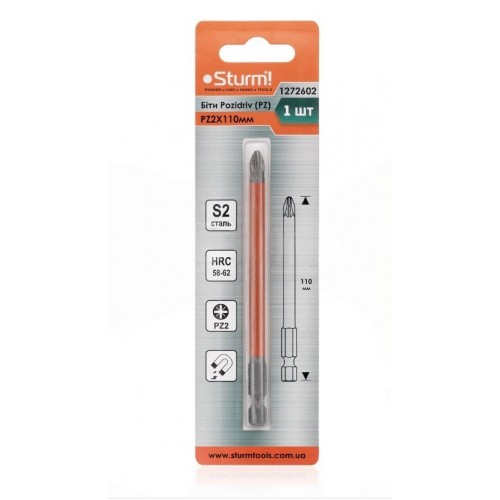 Біта S2 PZ2x110 мм, 1шт Sturm 1272602 - довжиною 110 мм, для закручування та відкручування кріплень із хрестоподібним шліцом PZ2. На відміну від класичних хрестоподібних біт PH, біти з шліцом PZ мають додаткову насічку, що забезпечує краще зачеплення. Завдяки стандартному шестигранному хвостовику ¼ дюйма вона сумісна як із ручними, так і з електроінструментами (шуруповерти, акумуляторні викрутки, дрилі). Виконана з високоякісної S2 сталі, з підвищеним вмістом вуглецю та легуючими елементами (молібден, ванадій, хром), що забезпечує твердість HRC 58–62 і довговічність при інтенсивному використанні.