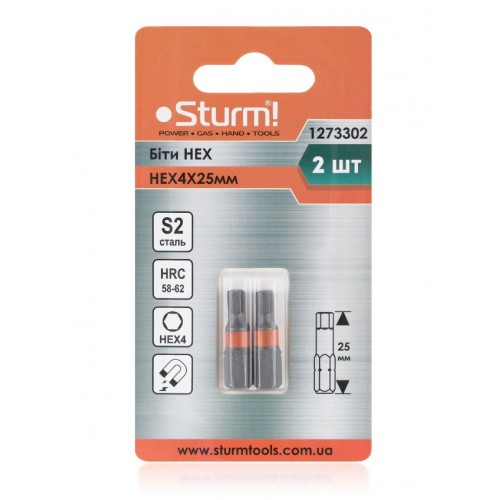 Біти S2 HEX4x25мм, 2шт Sturm 1273302 - довжиною 25 мм, для закручування та відкручування кріплень з шестигранним типом шліцю HEX4. Завдяки стандартному шестигранному хвостовику ¼ дюйма вона сумісна як із ручними, так і з електроінструментами (шуруповерти, акумуляторні викрутки, дрилі). Виконана з високоякісної S2 сталі, з підвищеним вмістом вуглецю та легуючими елементами (молібден, ванадій, хром), що забезпечує твердість HRC 58–62 і довговічність при інтенсивному використанні.