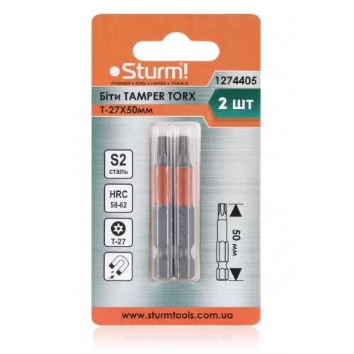 Біти S2 T-27×50 мм Tamper, 2шт 1274405 - довжиною 50 мм призначена для відкручування та закручування кріпильних виробів з типом шліцю TORX 27. Завдяки шестигранному хвостовику ¼ дюйма вона сумісна як з ручними, так і з електроінструментами (шуруповерти, акумуляторні викрутки, дрилі). Виконана з високоякісної S2 сталі, з підвищеним вмістом вуглецю та легуючими елементами (молібден, ванадій, хром), що забезпечує жорсткість HRC 58 - 62 та довговічність при інтенсивному використанні. Для запобігання вислизанню з кріплення робоча частина біти намагнічена.