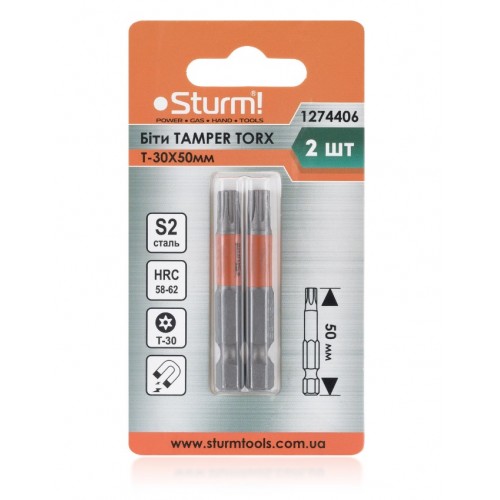 Біти S2 T-30×50 мм Tamper, 2шт 1274406 - довжиною 50 мм призначена для відкручування та закручування кріпильних виробів з типом шліцю TORX 30. Завдяки шестигранному хвостовику ¼ дюйма вона сумісна як з ручними, так і з електроінструментами (шуруповерти, акумуляторні викрутки, дрилі). Виконана з високоякісної S2 сталі, з підвищеним вмістом вуглецю та легуючими елементами (молібден, ванадій, хром), що забезпечує жорсткість HRC 58 - 62 та довговічність при інтенсивному використанні. Для запобігання вислизанню з кріплення робоча частина біти намагнічена.