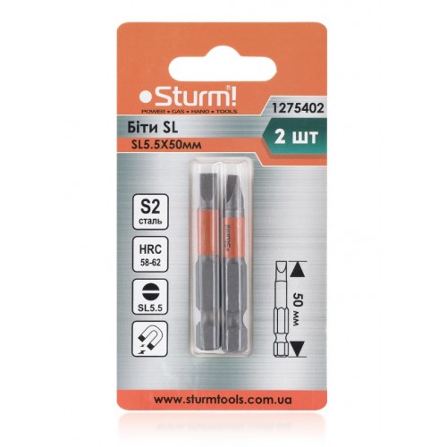 Біти S2 SL5.5×50 мм, 2шт 1275402 - довжиною 50 мм, для закручування та відкручування кріплень з плоским шліцом SL5.5. Завдяки стандартному шестигранному хвостовику ¼ дюйма вона сумісна як із ручними, так і з електроінструментами (шуруповерти, акумуляторні викрутки, дрилі). Виконана з високоякісної S2 сталі, з підвищеним вмістом вуглецю та легуючими елементами (молібден, ванадій, хром), що забезпечує твердість HRC 58 - 62 і довговічність при інтенсивному використанні.