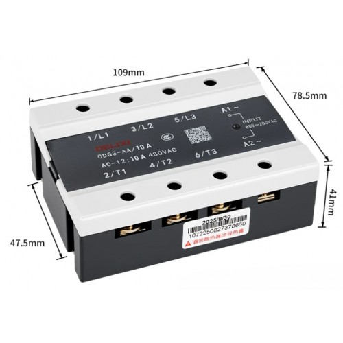 Трифазне твердотільне реле CDG3-AA/10A використовує сучасні напівпровідникові компоненти для безконтактної комутації потужних трифазних навантажень. Модель із маркуванням AA - має керування змінним струмом (AC), що дозволяє підключати її безпосередньо до мережі без додаткових джерел живлення. Реле працює з керуючою напругою 80–280В AC, тобто може вмикатись напряму від мережі (наприклад, 220 В).