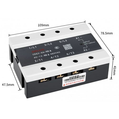 Трифазне твердотільне реле CDG3-AA/60A використовує сучасні напівпровідникові компоненти для безконтактної комутації потужних трифазних навантажень. Модель із маркуванням AA - має керування змінним струмом (AC), що дозволяє підключати її безпосередньо до мережі без додаткових джерел живлення. Реле працює з керуючою напругою 80–280В AC, тобто може вмикатись напряму від мережі (наприклад, 220 В).