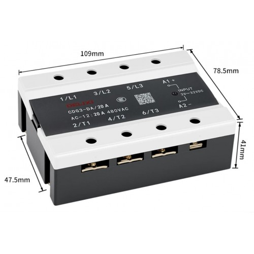 Трифазне твердотільне реле CDG3-DA/20A використовує передові напівпровідникові компоненти для безконтактної комутації потужних електричних ланцюгів. Маркування DA означає, що реле керується постійним струмом (DC) та призначене для комутації змінного струму (AC). Реле працює з керуючою напругою 3-32В DC, що дозволяє використовувати його з контролерами, ПЛК, Arduino та іншими низьковольтними джерелами сигналу.