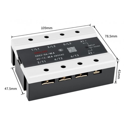 Трифазне твердотільне реле CDG3-DA/40A використовує передові напівпровідникові компоненти для безконтактної комутації потужних електричних ланцюгів. Маркування DA означає, що реле керується постійним струмом (DC) та призначене для комутації змінного струму (AC). Реле працює з керуючою напругою 3-32В DC, що дозволяє використовувати його з контролерами, ПЛК, Arduino та іншими низьковольтними джерелами сигналу.