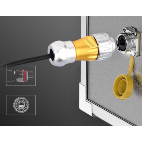 Герметичний роз'єм RJ45 серії DH-24-J/RJ45/213/SX-43-101 - панельна розетка категорії CAT5E з резиновою захисною кришкою та кріпленнім до блоку гайкою, зі спеціального сплаву, який зменшує електромагнітні та радіочастотні перешкоди, з особливою технологією з'єднання. Цей сплав стійкий до корозії, стійкий до температури і тиску.