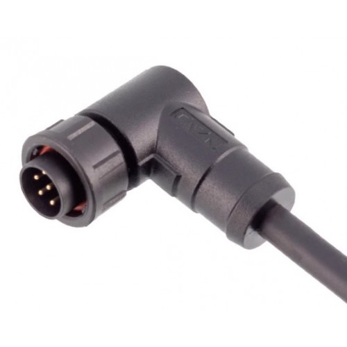 Кутова кабельна вилка E10B-P12-MWD-1PV - водонепроникний пластиковий конектор на 12 контактів з байонетним з'єднанням. З'єднує ланцюг до і напругою до 30В. Контакти конектора вироблені з міді і покриті золотом - золото має низький опір, що покращує передачу сигналів і зменшує нагрівання в точках контакту, забезпечує стабільний електричний контакт, знижуючи ризик втрати сигналу через окиси чи забруднення.