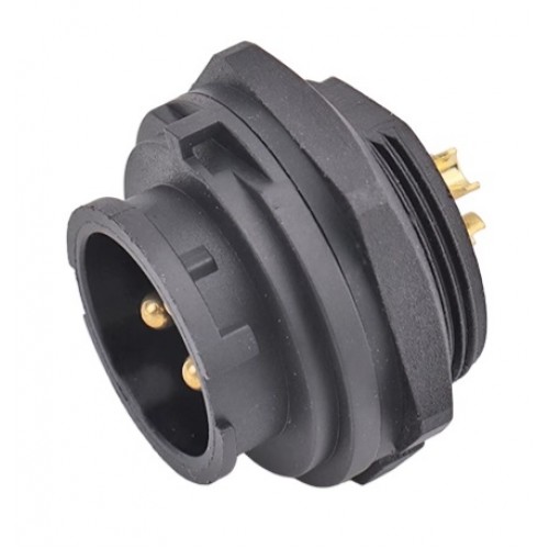 Панельна вилка E13B-P3-PWB - водонепроникний пластиковий конектор на 3 контакта з байонетним з'єднанням, гайкою позаду. З'єднує ланцюг до 20А і напругою до 125В. Контакти конектора вироблені з міді і покриті золотом - золото має низький опір, що покращує передачу сигналів і зменшує нагрівання в точках контакту, забезпечує стабільний електричний контакт, знижуючи ризик втрати сигналу через окиси чи забруднення.