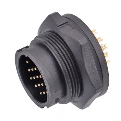 Панельна вилка E13B-P4-PWF - водонепроникний пластиковий конектор на 4 контакта з байонетним з'єднанням, гайкою спереду. З'єднує ланцюг до 10А і напругою до 125В. Контакти конектора вироблені з міді і покриті золотом - золото має низький опір, що покращує передачу сигналів і зменшує нагрівання в точках контакту, забезпечує стабільний електричний контакт, знижуючи ризик втрати сигналу через окиси чи забруднення.