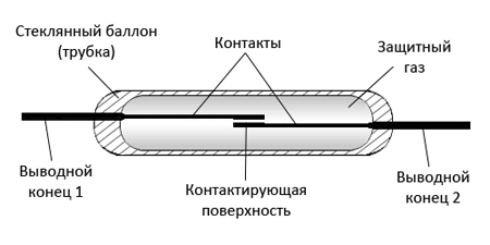 Контакти - два або три плоских відрізка дроту з феромагнітного сплаву. Між ними є маленький зазор - контактує поверхню, покрита шаром благородного металу (золотом, родием, паладієм або сплавами на основі золота).