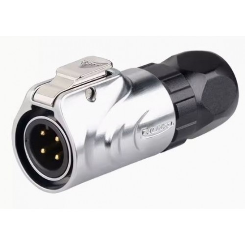 Герметичний роз'єм живлення серії LP - LP-12-C04PE-03-001 - 4-х контактна герметична кабельна вилка з замком в металевому корпусі серії LP з прямим виводом під кабель 24 AWG. Розетка має прохідний діаметр - 12 мм, з'єднує ланцюг до 5 А і напругою до 150 В.
