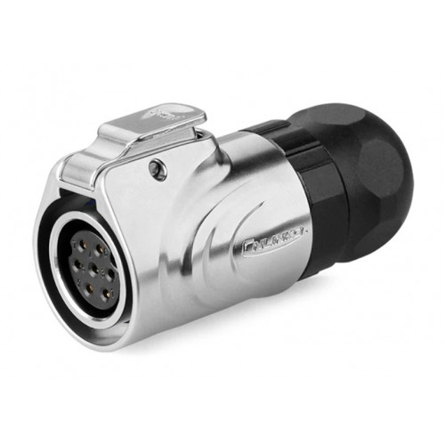 Герметичний роз'єм живлення серії LP - LP-16-J07PE-03-001 - 7-х контактна герметична кабельна розетка серії LP в металі, з'єднує ланцюг з навантаженням до 10А и 400В, з прямим виводом під кабель 18-16 AWG і з замком, який забезпечує надійне замикання з'єднувачів та герметичність. Розетка має прохідной діаметр - 16 мм.