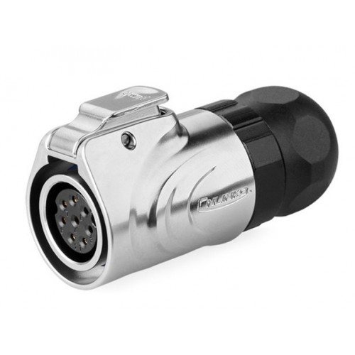 Герметичний роз'єм живлення серії LP - LP-16-J08PE-03-001 - 8-х контактна герметична кабельна розетка серії LP в металі, з'єднує ланцюг з навантаженням до 10А и 400В, з прямим виводом під кабель 18-16 AWG і з замком, який забезпечує надійне замикання з'єднувачів та герметичність. Розетка має прохідной діаметр - 16 мм.