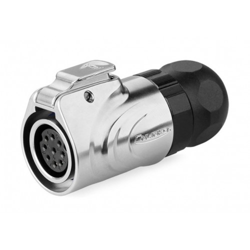 Герметичний роз'єм живлення серії LP - LP-16-J09PE-03-001 - 9-х контактна герметична кабельна розетка серії LP в металі, з'єднує ланцюг з навантаженням до 10А и 400В, з прямим виводом під кабель 18-16 AWG і з замком, який забезпечує надійне замикання з'єднувачів та герметичність. Розетка має прохідной діаметр - 16 мм.