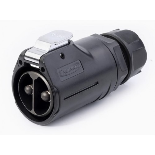Герметичний роз'єм живлення серії LP -  LP-28-C02PE-22-001 -  2-х контактна  герметична кабельна вилка серії LP з прямим виведенням під кабель 8-6  AWG і замком. З'єднує електричний ланцюг до 100 А та напругою до 500 В.  Електричний монтаж проводиться методом обтиску жили дроти.