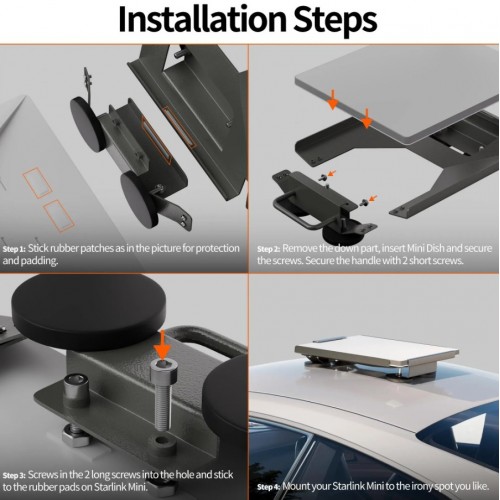 Кріплення можна використовувати на різних поверхнях із чорних металів, включаючи дахи автомобілів, залізні дахи та металеві полиці. Така адаптивність робить його універсальним рішенням як для тимчасового, так і для постійного встановлення, надаючи вам гнучкість у виборі оптимального місця для вашого Starlink Mini.