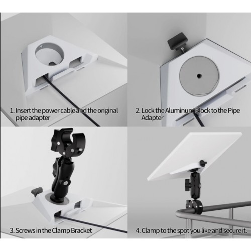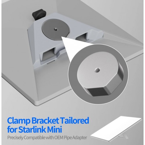 Крабоподібний затискний механізм надійно кріпиться до стовпів та прутів діаметром від 15 до 40 мм. Алюмінієвий блок, що входить до комплекту, розроблений для точного встановлення в оригінальний трубний адаптер, що постачається зі Starlink Mini, забезпечуючи надійне та безхибне з'єднання.