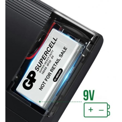 - Працює автономно — достатньо звичайної 9 В батареї, що не додається.