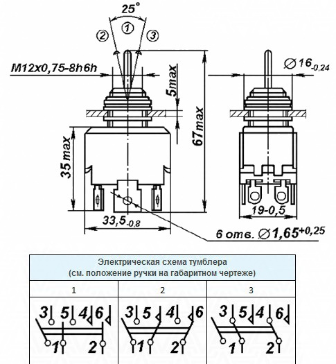 Контактна група перемикачів виконує функції включення, відключення або перемикання в одному або двох напрямках ланцюга, з фіксацією важеля в різних положеннях. У деяких тумблерах передбачена підсвічування у вигляді світиться ручки. Тумблери кріпляться в отворі на панелі шляхом фіксації за допомогою нарізного сполучення.