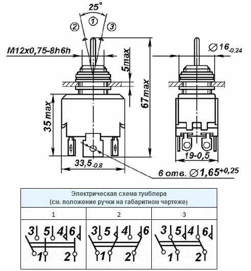 Тумблер П2Т-1 П2Т-4Л світится В одному крайньому і середньому положенні
