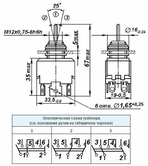 Контактна група перемикачів виконує функції включення, відключення або перемикання в одному або двох напрямках ланцюга, з фіксацією важеля в різних положеннях. У деяких тумблерах передбачена підсвічування у вигляді світиться ручки. Тумблери кріпляться в отворі на панелі шляхом фіксації за допомогою нарізного сполучення.