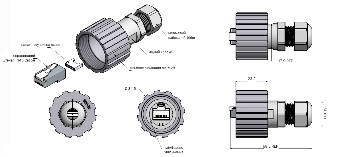 Герметичний роз'єм RJ45-CO-17-100474 - мережевий конектор, розроблений для надійного та герметичного підключення Ethernet-кабелів в умовах підвищеної вологості, пилу та механічних навантажень. Підтримує стандарт Cat 5e та конфігурацію контактів 8p8c, забезпечуючи передачу даних Ethernet на швидкостях до 1 Гбіт/с. Екранована конструкція захищає сигнал від електромагнітних перешкод, а байонетна система фіксації гарантує міцне та швидке з'єднання.