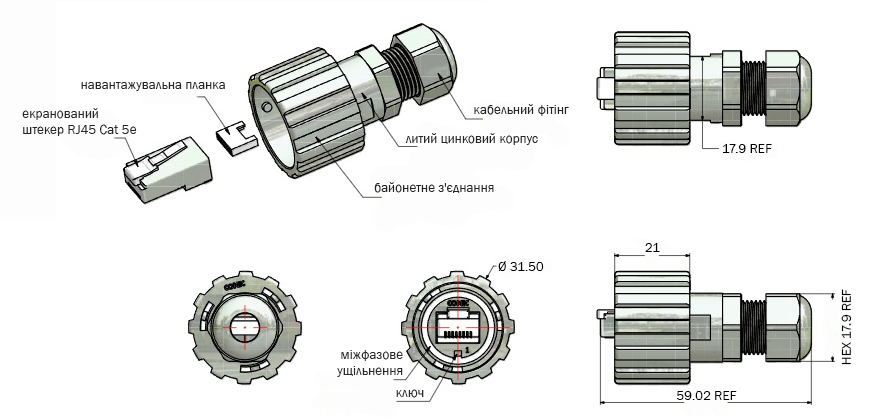 - Клас захисту: IP67 (повний пило- та вологозахист при підключенні з частиною у відповідь)