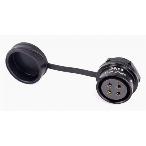Роз'єм Weipu SA2412/S4-3 – панельна розетка на 4 контакта, призначена для роботи з напругою 500 В та струмовим навантаженням до 25 А, має посадковий діаметр 24 мм. Виводи на кабель з'єднуються за допомогою обтискання контактів.