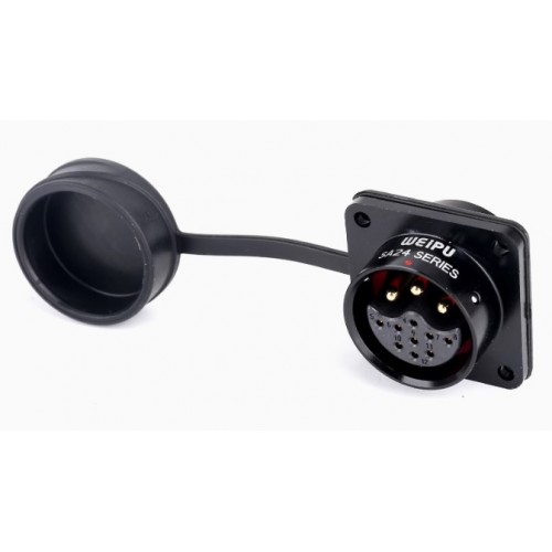 Роз'єм Weipu SA2413/S12B  панельна розетка на 12 контактів, з кріпленням до панелі на 4 гвинта.  Призначена для роботи з напругою 500 В та струмовим навантаженням до 30 А, має посадковий діаметр 24 мм.