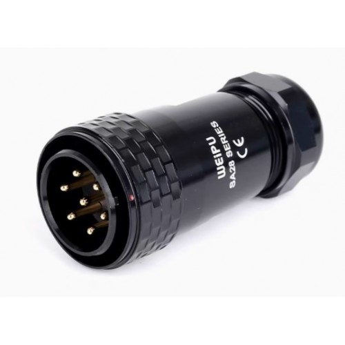 Роз'єм Weipu SA2810/P7 – кабельна вилка на 7 контактів, призначена для роботи з напругою 500 В та струмовим навантаженням до 25 А, має посадковий діаметр 28 мм.