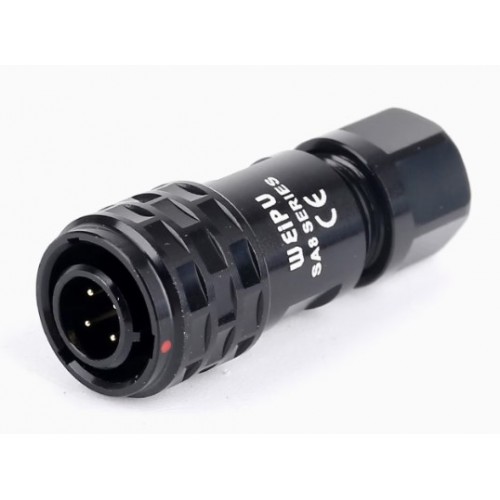 Роз'єм Weipu SA810/P4  кабельна вилка на 4 контакта, призначена для роботи з напругою 30 В та струмовим навантаженням до 3 А, має посадковий діаметр 8 мм.
