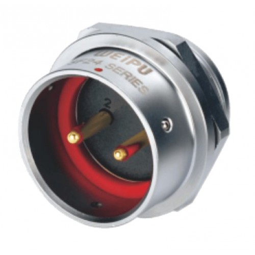 Роз'єм Weipu SF2412/P2 - панельна вилка на 2 контакти, призначена для роботи з напругою 500B та струмовим навантаженням до 25A, має посадковий діаметр 24 мм.