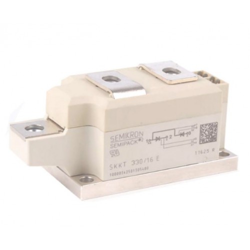 Модуль SKKT330/16E це перетворювач контролер, основою якого є монолітна конструкція з двома напівпровідниковими тиристорами (тип тиристор-тиристор). Особливістю конструкції модулів SEMIPACK є використання пружинних з'єднань виводів управління з струмонесучими шинами. Надійність та стабільність параметрів пружинних контактів – невід'ємний елемент конструкції модулів SEMIKRON.