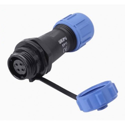 Роз'єм Weipu SP1111C/S4 - міжкабельна розетка на 4 контакта з різьбовим з'єднанням. Діаметр контактів 1 мм, номінальне навантаження 180В, струм 5А.