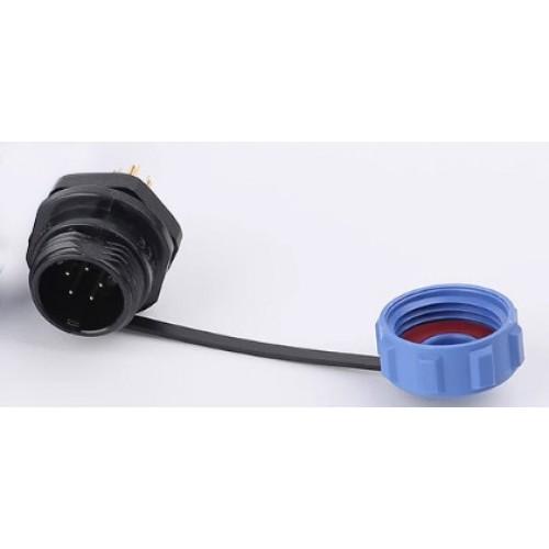 Роз'єм Weipu SP1112/P5 - панельна вилка на 5 контактів з різьбовим з'єднанням. Діаметр контактів 1 мм, номінальне навантаження 180В, струм 5А.