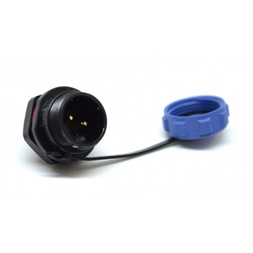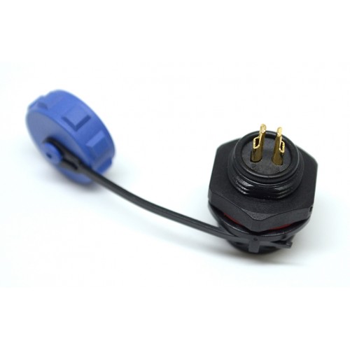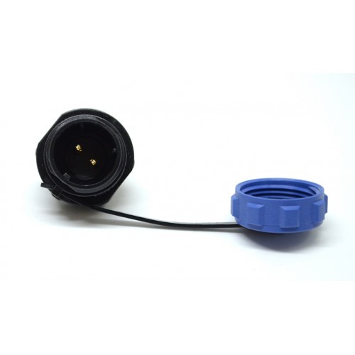 Роз'єм Weipu SP1312/P2 - панельна вилка на 2 контакта з різьбовим з'єднанням. Діаметр контактів 1.6 мм, номінальне навантаження 250В, струм 13А.