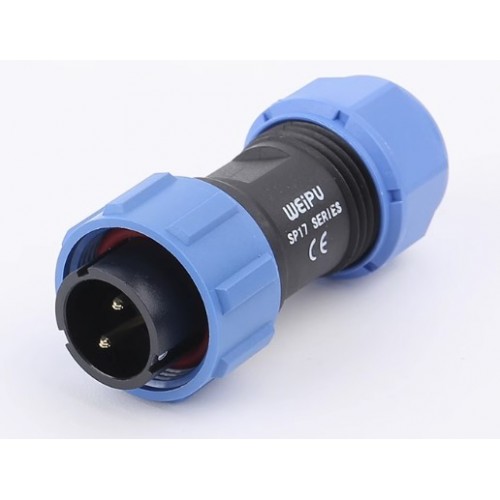 Роз'єм Weipu SP1710/P2 - кабельна вилка на 2 контакта з різьбовим з'єднанням. Діаметр контактів 1.5 мм, номінальне навантаження 500В, струм 10А.