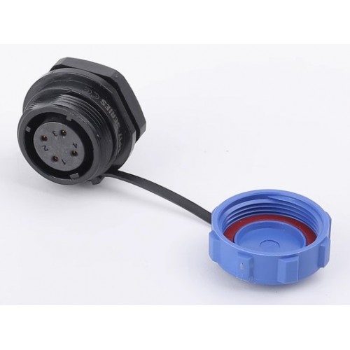 Роз'єм Weipu SP1712/S4 - панельна розетка на 4 контакта з різьбовим з'єднанням. Діаметр контактів 1 мм, номінальне навантаження 500В, струм 5А.