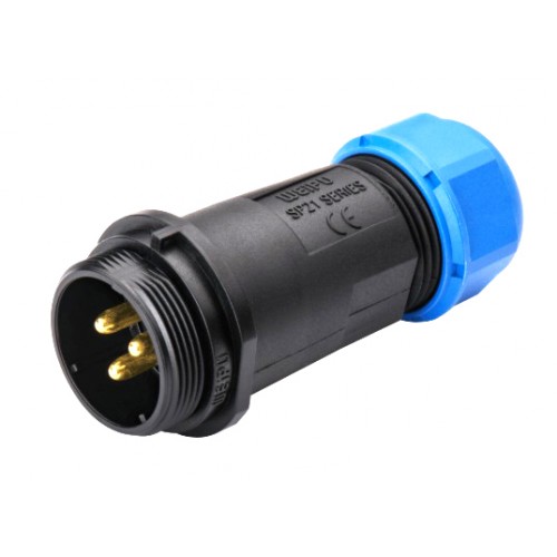 Роз'єм Weipu SP2111/P5-9 - міжкабельна вилка на 5 контакта з різьбовим з'єднанням. Діаметр контактів 3 мм, номінальне навантаження 500В, струм 30А.