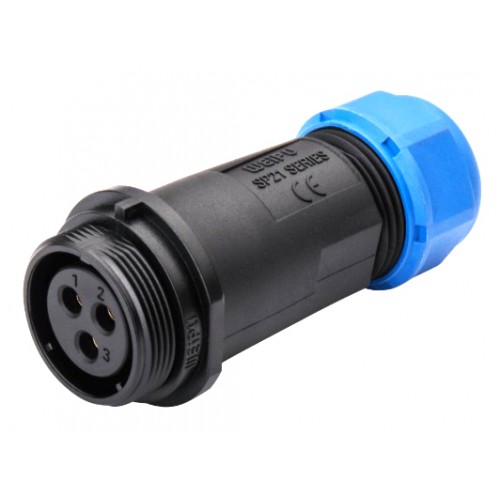 Роз'єм Weipu SP2111/S4-9 - міжкабельна розетка на 4 контакта з різьбовим з'єднанням. Діаметр контактів 3 мм, номінальне навантаження 500В, струм 30А.