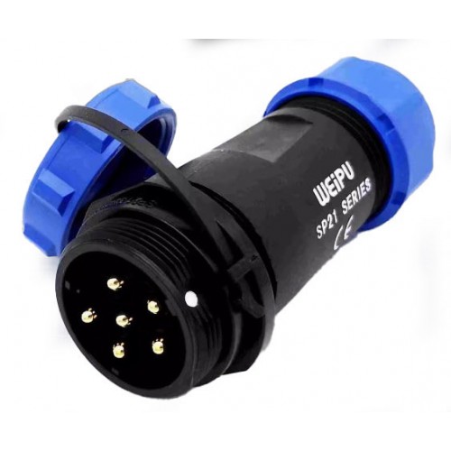 Роз'єм Weipu SP2111/P6 - міжкабельна вилка на 6 контактів з різьбовим з'єднанням. Діаметр контактів 2,5 мм і 1,00 мм, номінальне навантаження 500В, струм 25А (4 контакта) і 5А (2 контакта).
