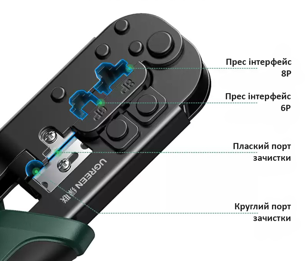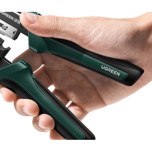 Обтискні кліщі UGREEN - використовується для підготовки проводів Ethernet (кабелі категорій 5/5e/6/6a 8P та телефонної кристалічної головки 6P), включаючи зняття ізоляції з окремих жил кабелю, а також для подальшого обтиснення проводів в конекторах RJ45.