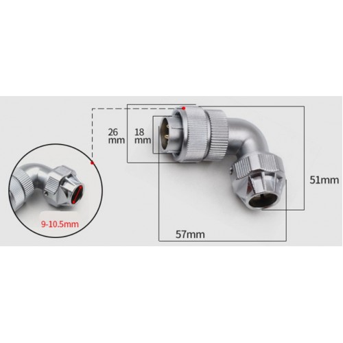 | Розміри та схема роз'ємів серії WF кабельної кутової вилки з металевою зажимною гайкою |