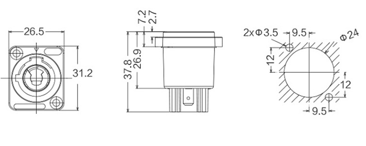 | Розміри кабельної вилки та панельної розетки | |